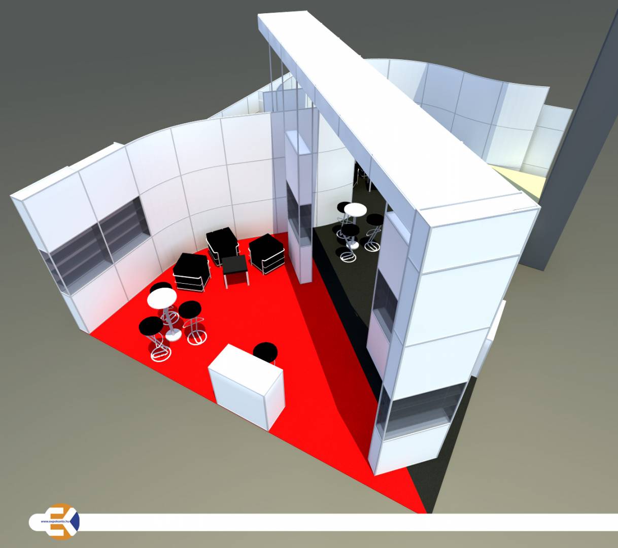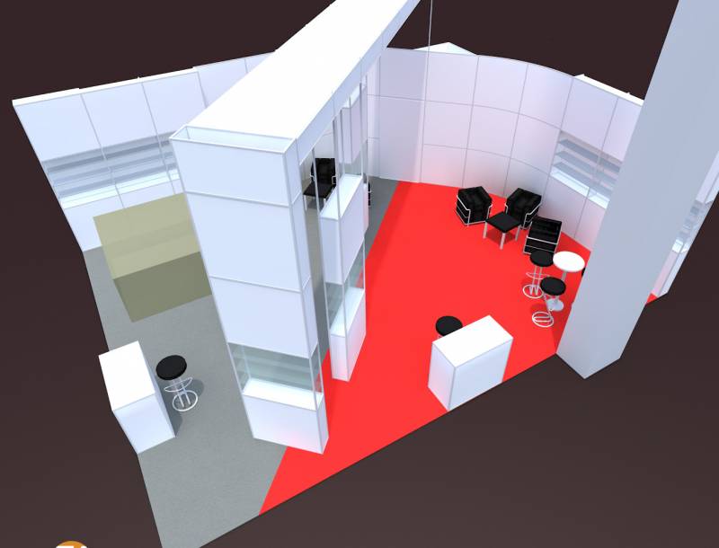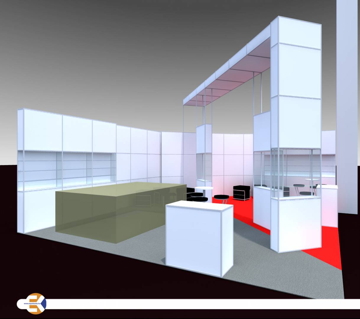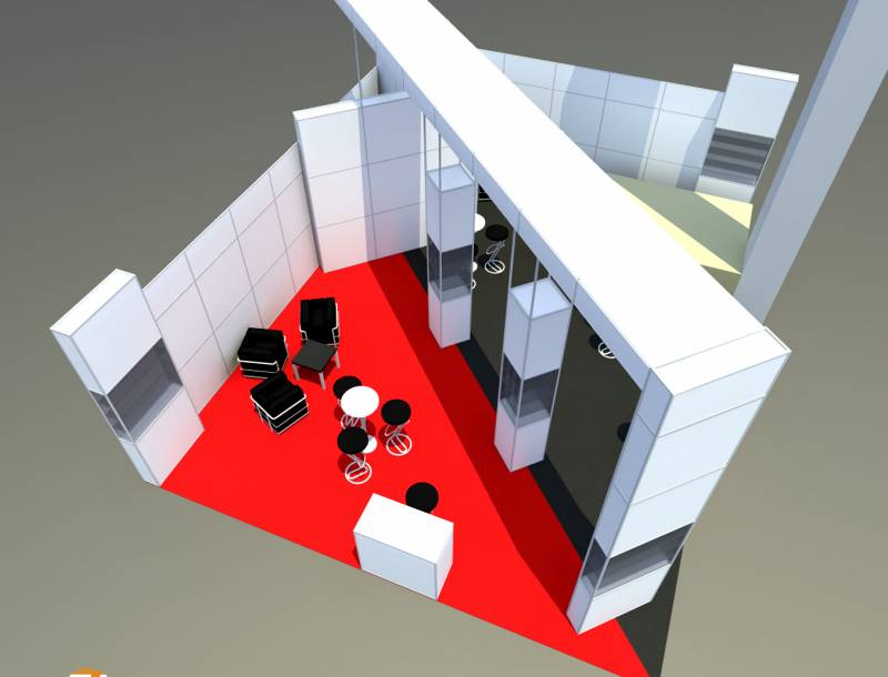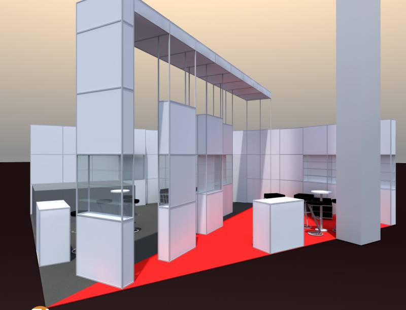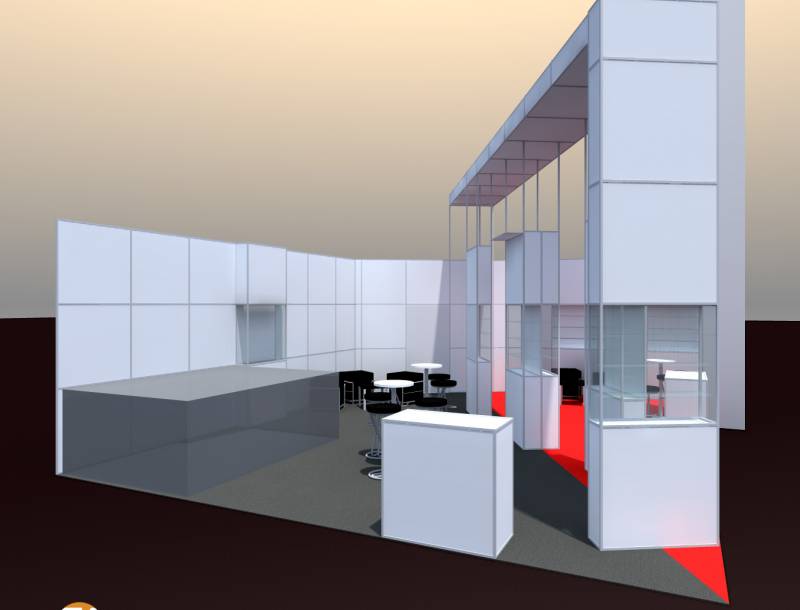 Egy cégcsoport 2 cége számára kialakított stand, melyet az átlósan felállított kapuzat emel ki a többi kiállító közül. Mind az oszlopokban, mind az oldalfalakban vitrines részt találhatunk.
