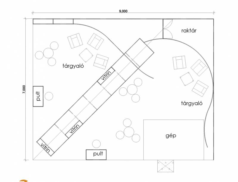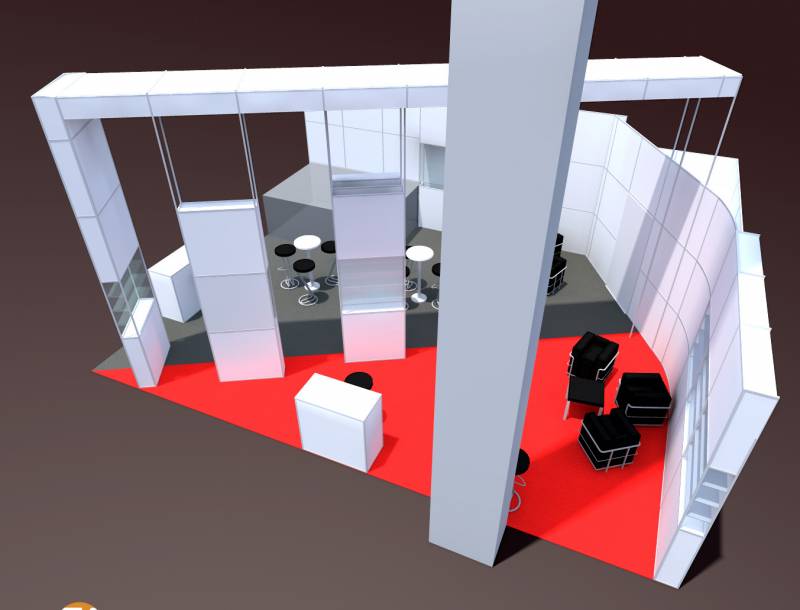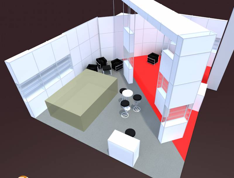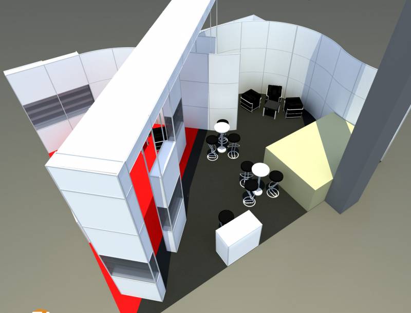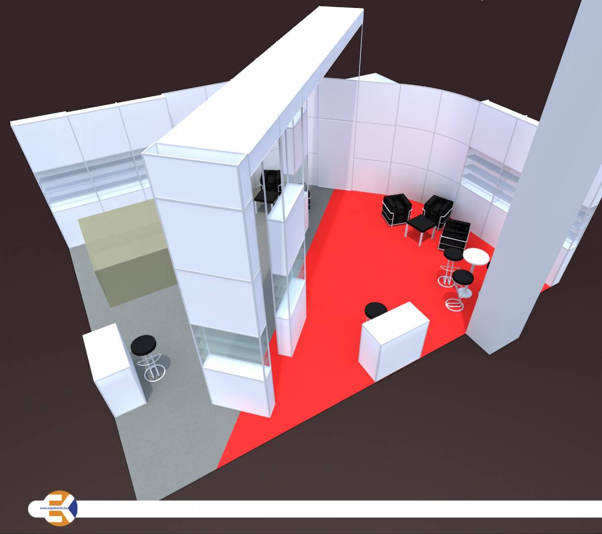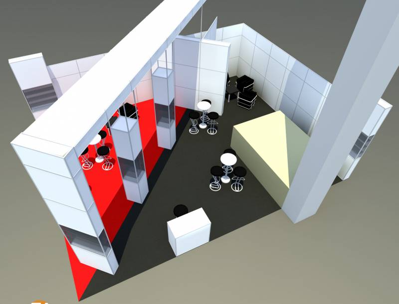 Egy cégcsoport 2 cége számára kialakított stand, melyet az átlósan felállított kapuzat emel ki a többi kiállító közül. Mind az oszlopokban, mind az oldalfalakban vitrines részt találhatunk.