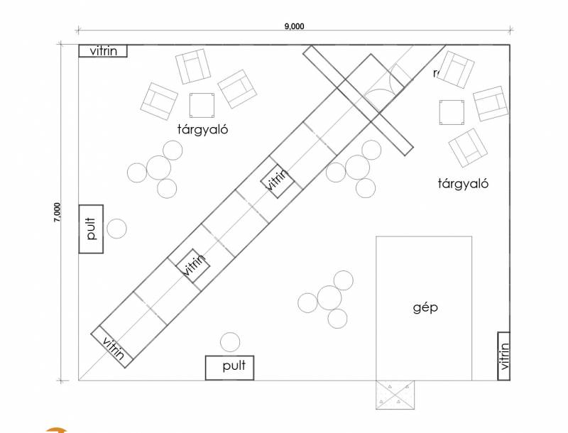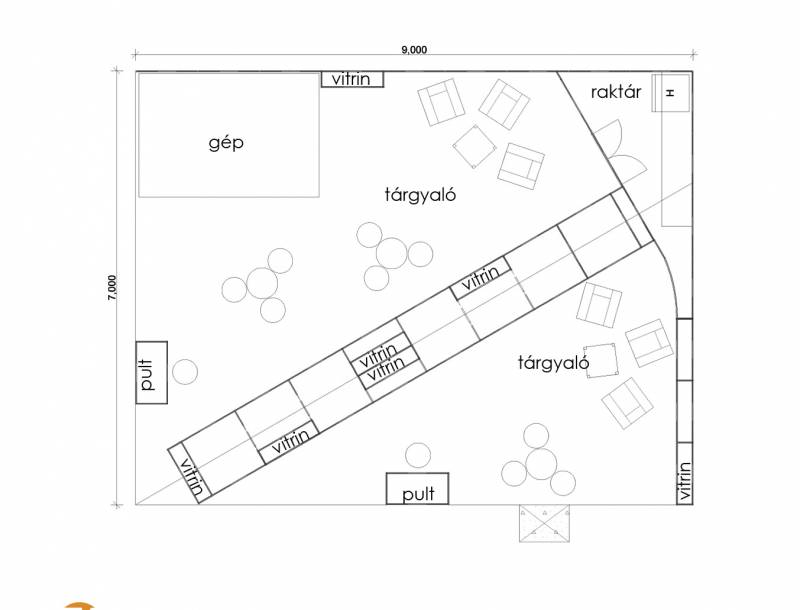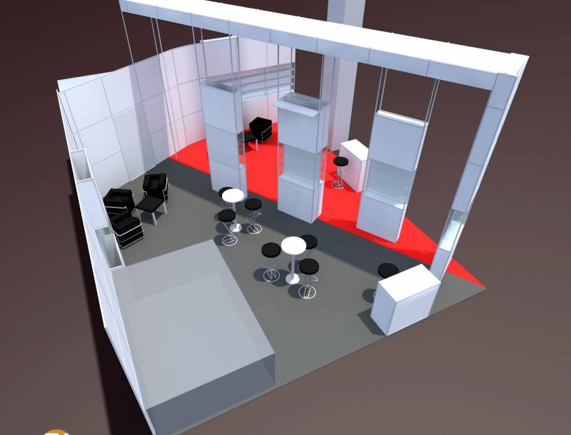 A vendégek fogadása minkét oldalon információs pultnál történik, innen tudnak a stand belsejében kialakított tárgyalóasztaloknál helyet foglalni.