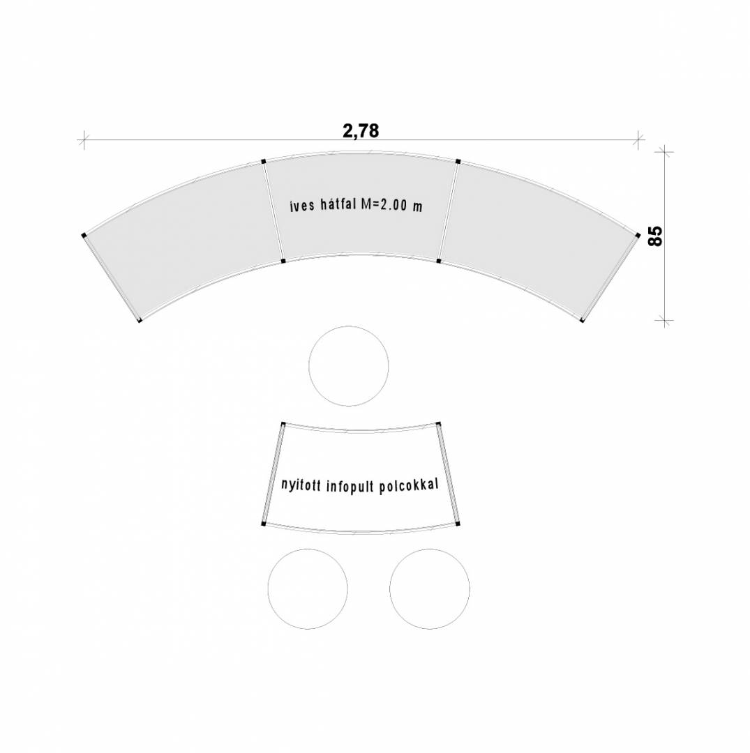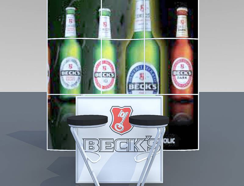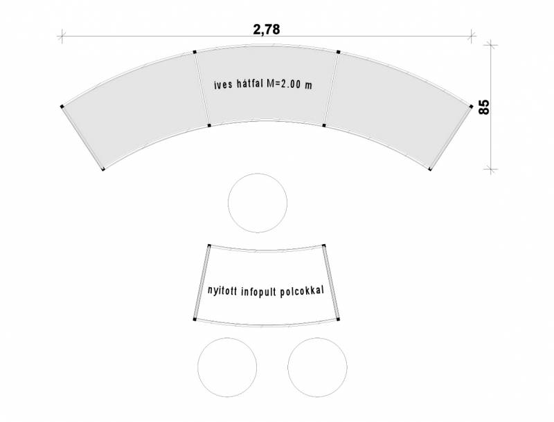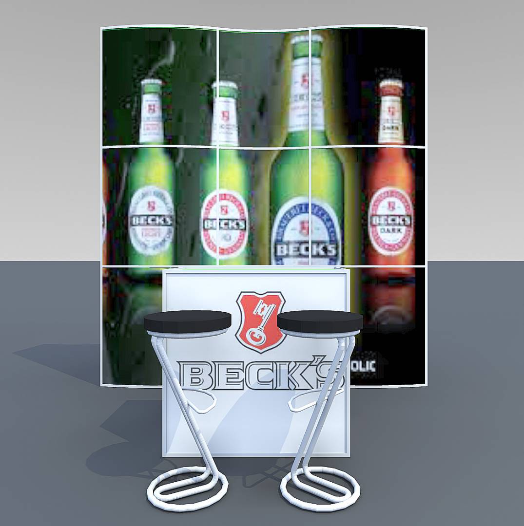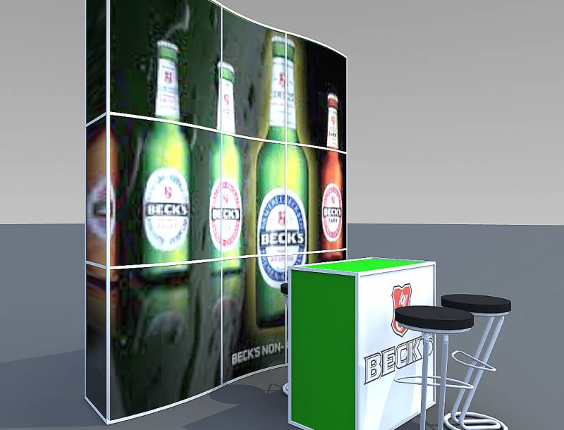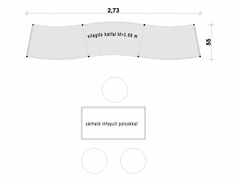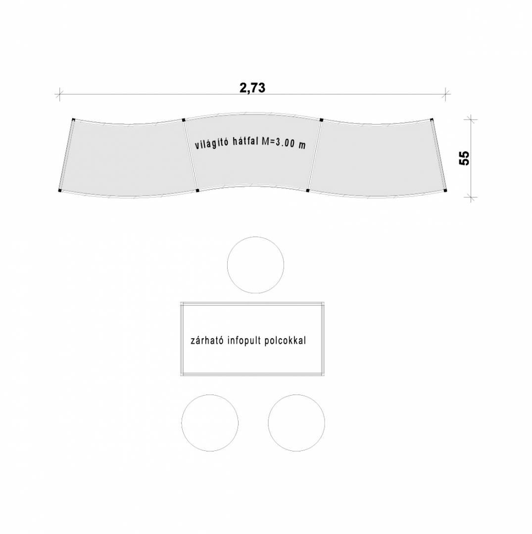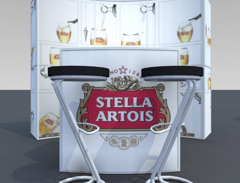 STELLA: Kis alapterületen is tudunk látványosat alkotni! A körbejárható stand mottója: kis helyen látványosat! Az íves szendvicsfalat teljes felületén grafikáztuk. Az információs- és egyben bárpult íve válasz a szemközti falra és keretbe zárja a standot. Két különleges bárszék áll a vendégek fogadására. A bemutatott stand alapterülete 3 m x 3 m.