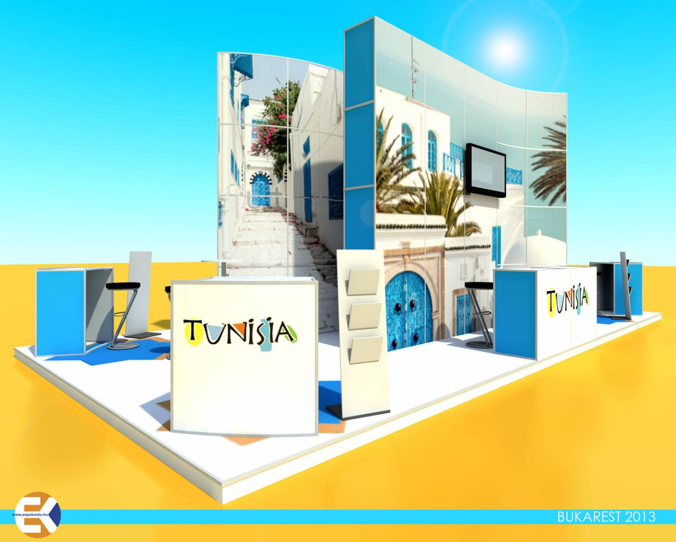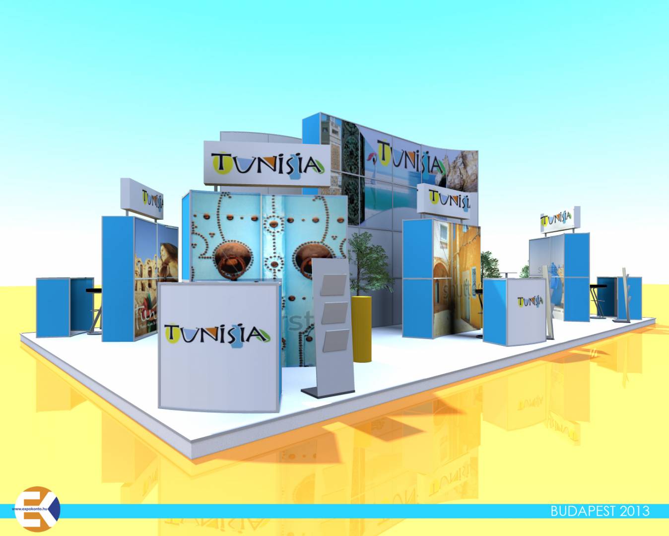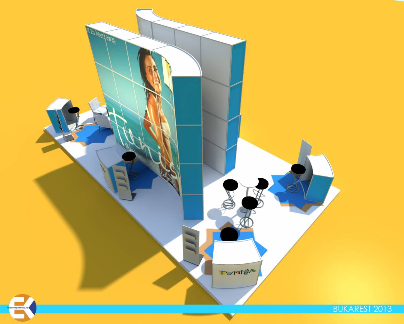 A stand oldalain információs pultnál fogadhatják a vendégeket, akikkel a stand négy sarkán kialakított